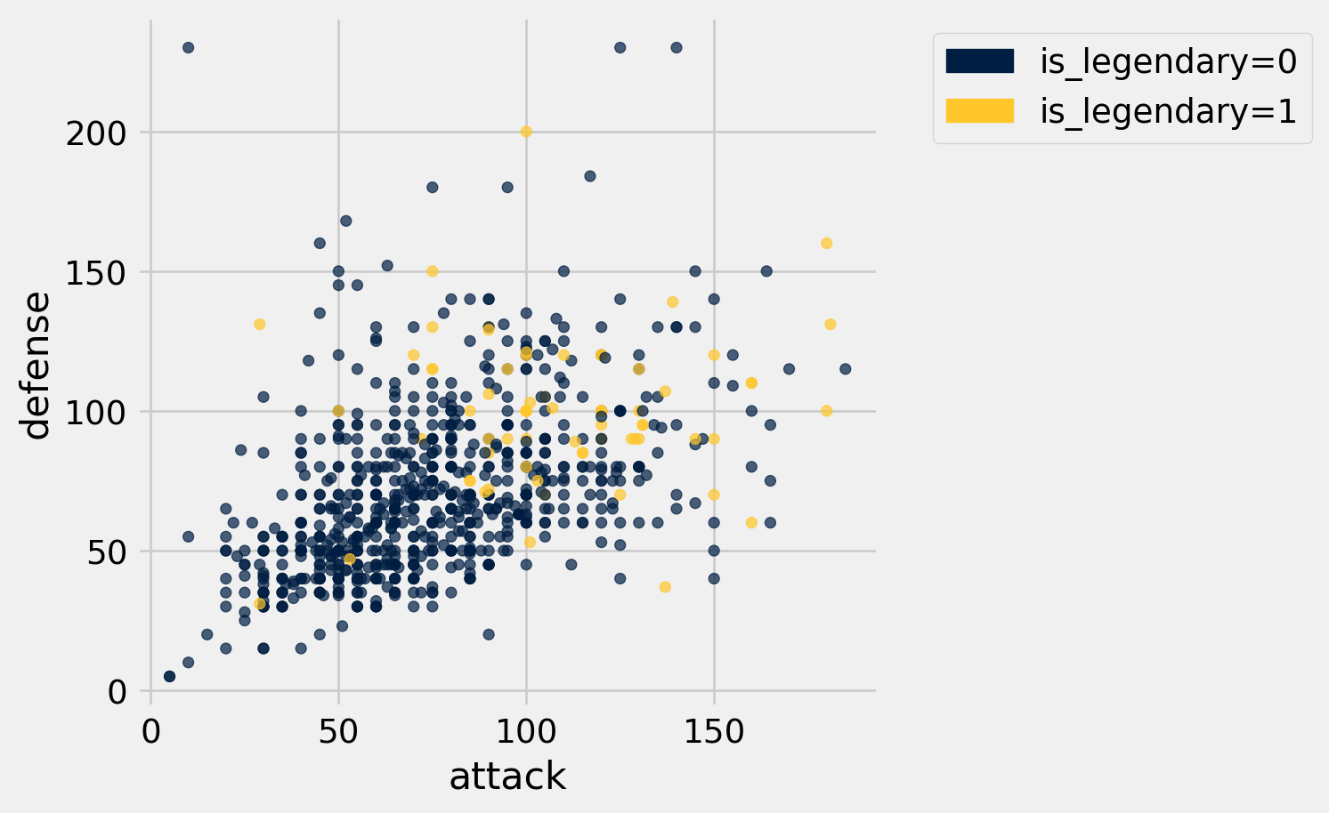 pokemon.scatter("attack", "defense", group="is_legendary")