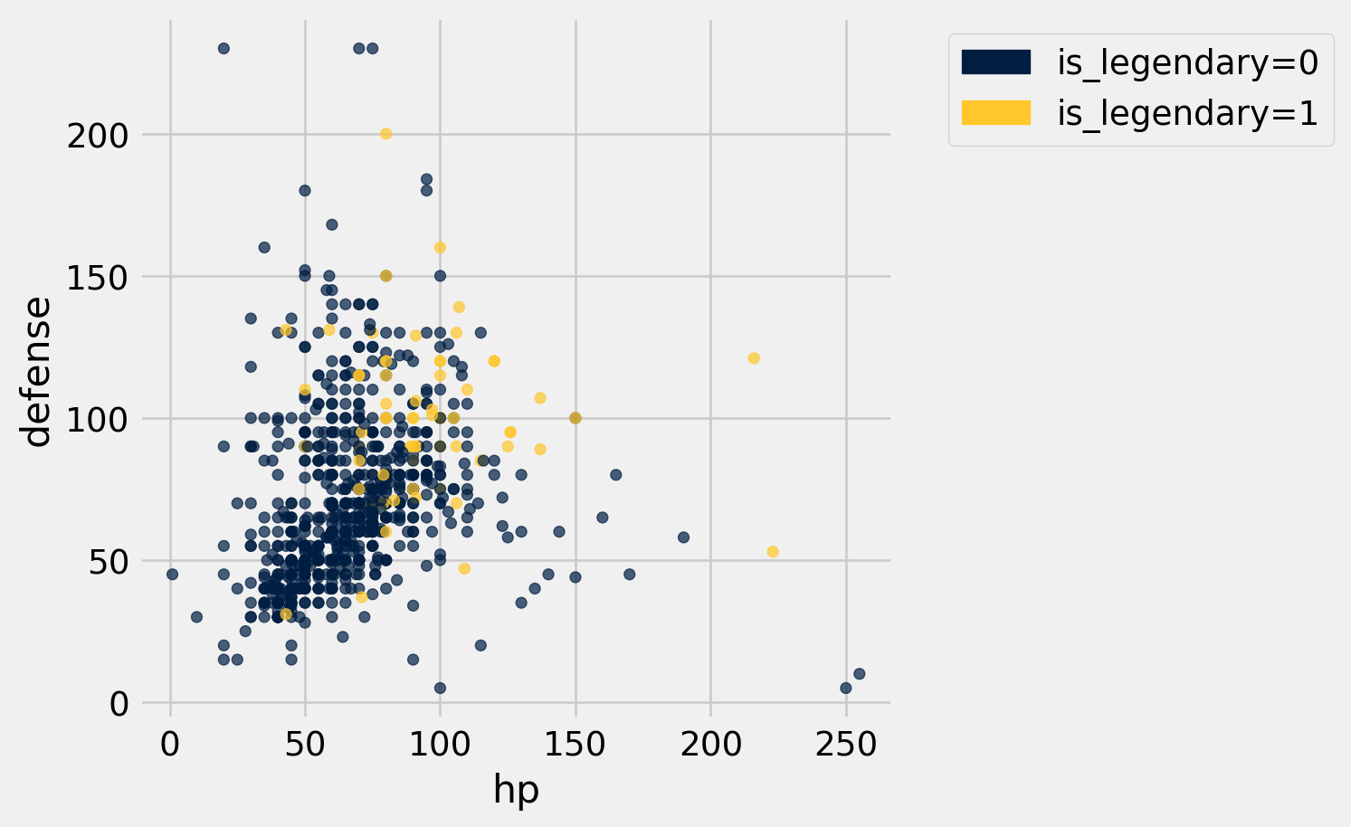 pokemon.scatter("hp", "defense", group="is_legendary")